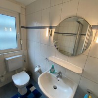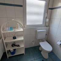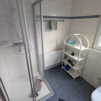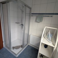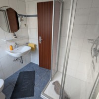 Das Badezimmer ist mit Dusche, WC und Waschbecken ausgestattet.