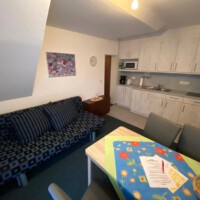 Die Küche ist komplett ausgestattet und verfügt über einen Wasserkocher, eine Kaffeemaschine, einen Eierkocher, einen Toaster, eine Mikrowelle sowie einen Kühlschrank mit Tiefkühlfach. Ferner befinden sich in der Küche ein Esstisch mit Ausziehmöglichkeit, vier Stühle sowie ein Schlafsofa.