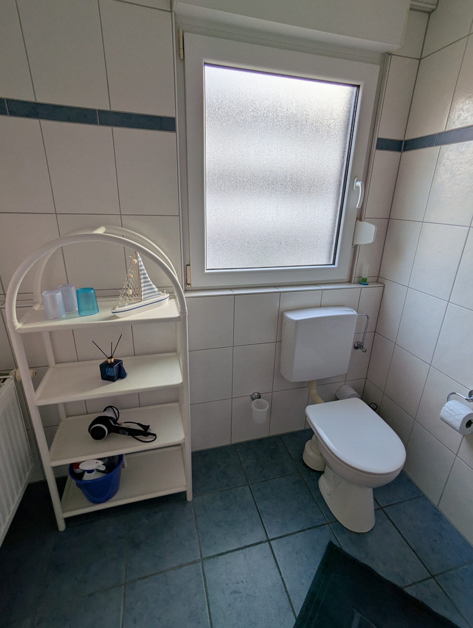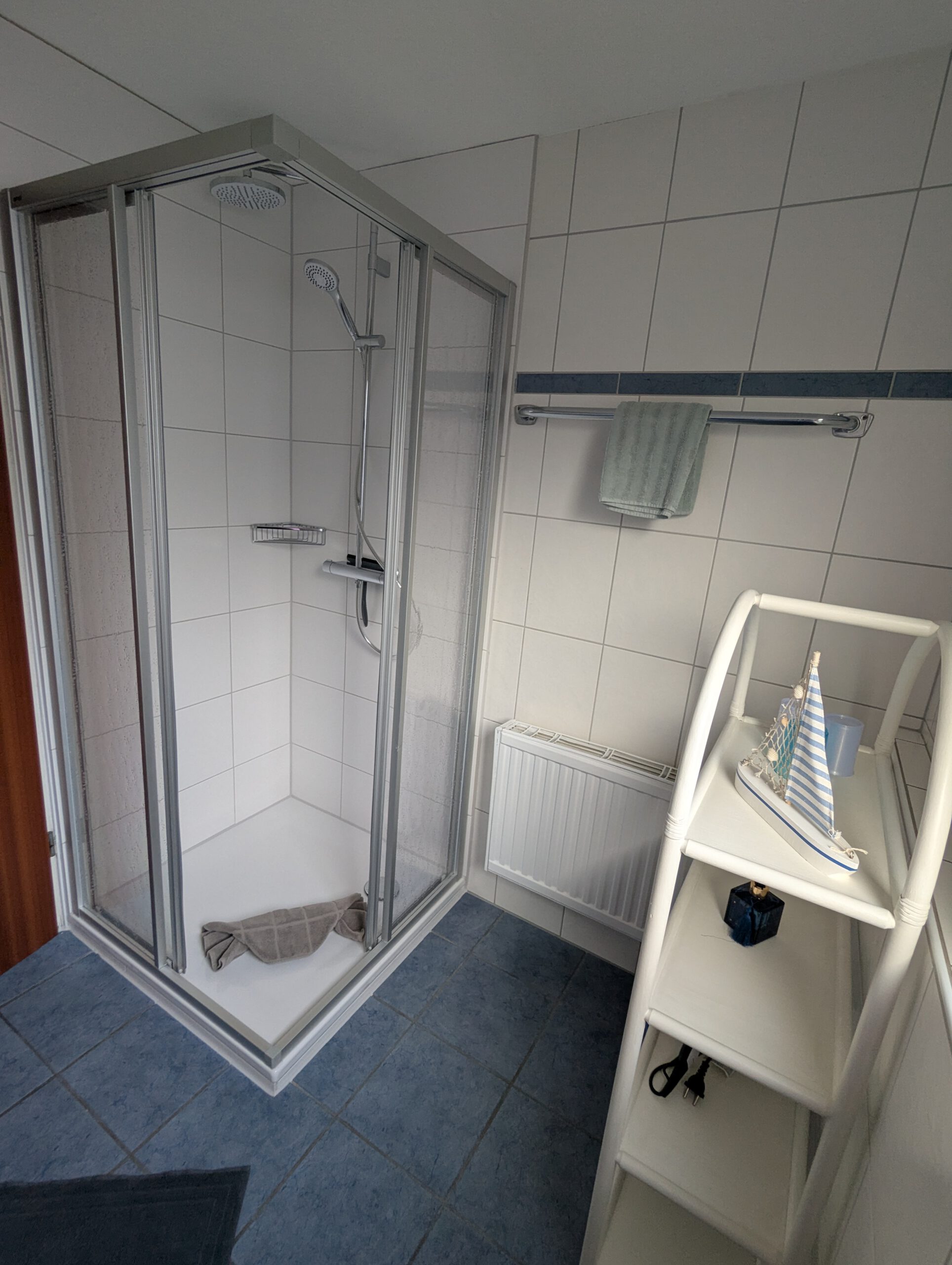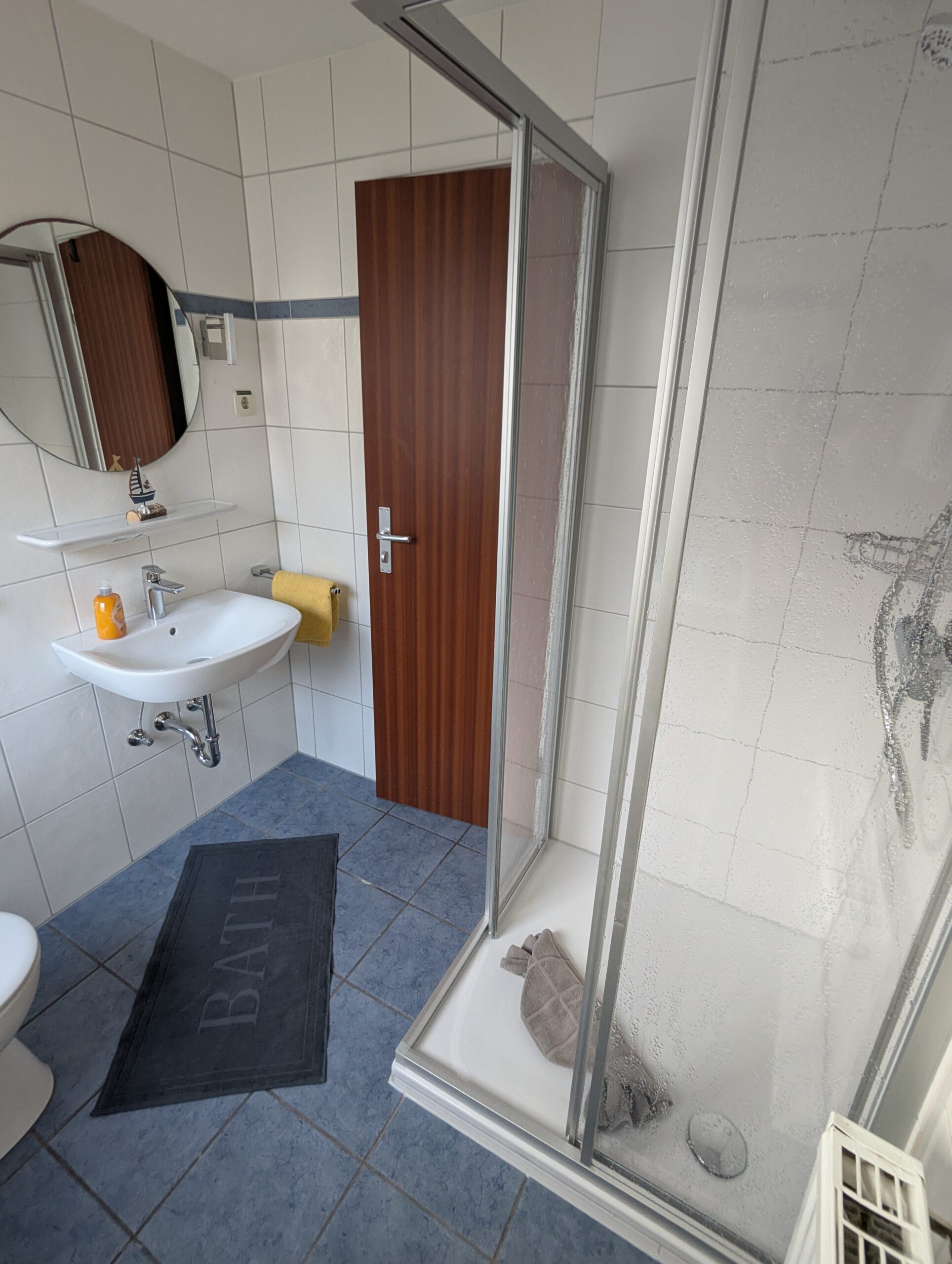 Das Badezimmer ist mit Dusche, WC und Waschbecken ausgestattet.