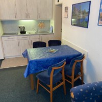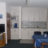 Die Küche ist komplett ausgestattet mit einem Wasserkocher, einer Kaffeemaschine, einem Eierkocher, einem Toaster, einer Mikrowelle sowie einem Kühlschrank mit Tiefkühlfach. Ferner befinden sich ein Esstisch mit Ausziehmöglichkeit und vier Stühle in der Küche.