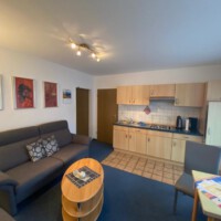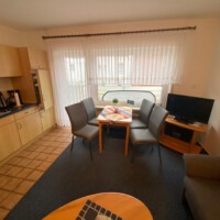 Im Wohnzimmer stehen ein 3er-Sofa und ein 2er-Sofa. Eine Küchenzeile sowie ein Esstisch sind ebenfalls vorhanden.